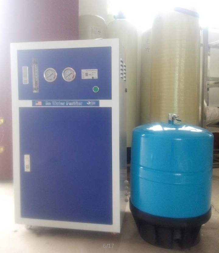 反渗透纯水机 型号:600G、 产品配置:全自动微电脑控制,数码显示,自动冲洗 五级过滤:PP+GAC+PP+RO+T33 适用水质:市政自来水 日产水量: 30~60L/H 制水方式:逆渗透 压力桶:11G内置压...